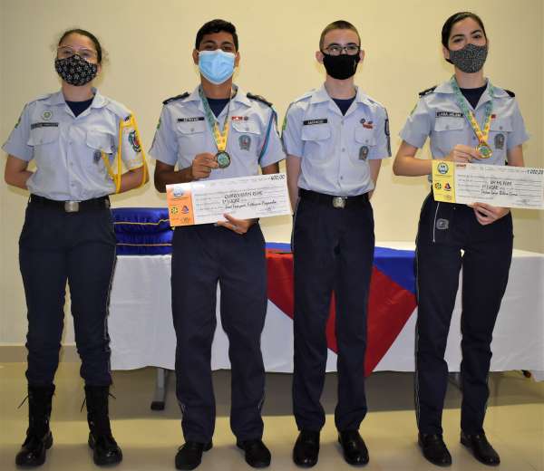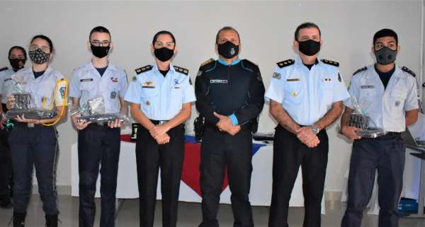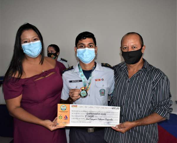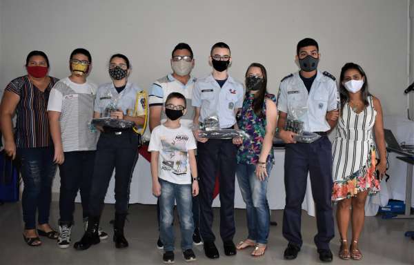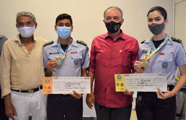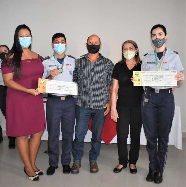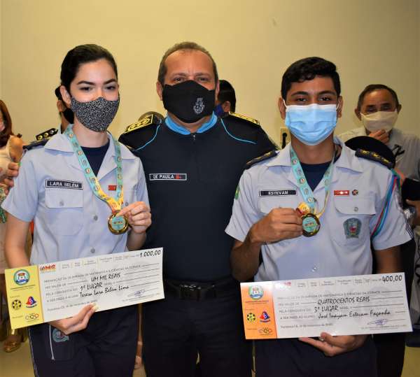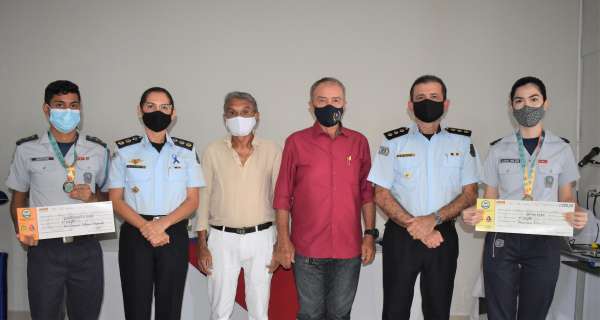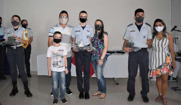 No primeiro ato de premiação, brindes foram entregues aos alunos Rayane de Freitas Pinto do 8º ano, Leonardo Amâncio Carlos do 9º ano e Cleyton Cauâ Santos Brito do 1º ano do Ensino Médio que participaram dos ‘aulões’ preparatórios da Olimpíada Nacional de Ciências. Os conteúdos foram ministrados pelos professores, Cabo PM Mauro Matias da CCPM e o professor Thiago Matias por meio da ferramenta Google Meet entre os dias 10 e 11 de setembro deste ano, abordando os conteúdos de física e química.