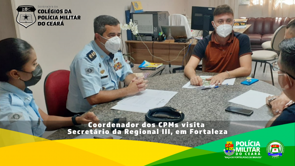 Na manhã desta quinta-feira, 10, o Coordenador dos Colégios da Polícia Militar, Coronel PM Porto, visitou o Secretário Executivo da Regional III, o vereador Michel Lins, em Fortaleza. A reunião tratou de assuntos sobre melhorias na acessibilidade e pavimentação no entorno do 1º CPMGEF.