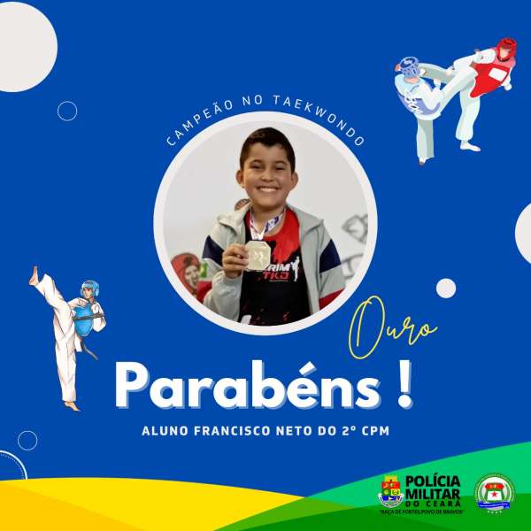 No último domingo, 27, a cidade de Fortaleza recebeu uma seletiva para o Campeonato Brasileiro de Taekwondo 2022. O evento, que integra a disputa do Campeonato Cearense da modalidade, ocorreu na unidade do SESC no centro da Capital. Dentre os participantes, o aluno Francisco Neto foi campeão na categoria cadete -45kg. O atleta que estuda no 7º ano B do 2º Colégio da Polícia Militar Coronel Hervano Macedo Junior, em Juazeiro do Norte, é campeão pela 7ª vez nesta categoria. Um estudante que orgulha sua família, além de despertar uma energia e disposição que incentiva a prática esportiva, no qual ele é merecidamente campeão. O 2º CPM brilha cada vez mais no campo esportivo com seu aluno que vale ouro.