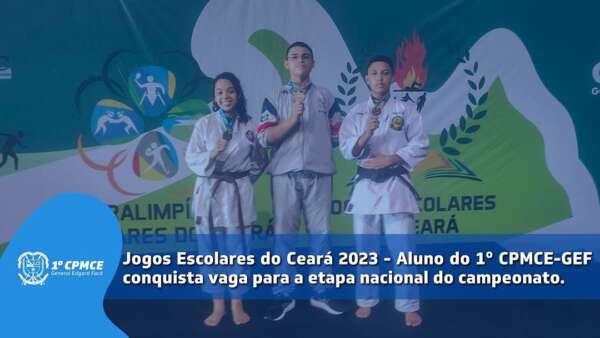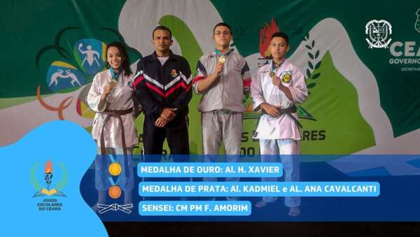 O 1º CPMCE_GEF parabeniza os nossos três talentosos alunos que se destacaram nos Jogos Escolares do Ceará 2023, na categoria de karatê, realizados no último sábado, 16. Al. H. Xavier brilhou na competição, conquistando a medalha de ouro e garantindo sua vaga na etapa nacional. Al. Kadmiel e Al. Ana Cavalcanti também receberam merecidamente medalhas de bronze.
