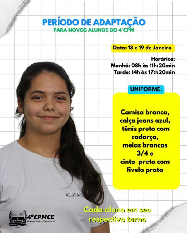 Nos dias 18 e 19 de janeiro, ocorrerá o período de adaptação para os novos alunos. Durante esses dias, os discentes serão acolhidos pelos monitores e receberão orientações sobre o funcionamento pedagógico e disciplinar dos Colégios da Polícia Militar do Ceará, estabelecendo as expectativas de comportamento esperado.