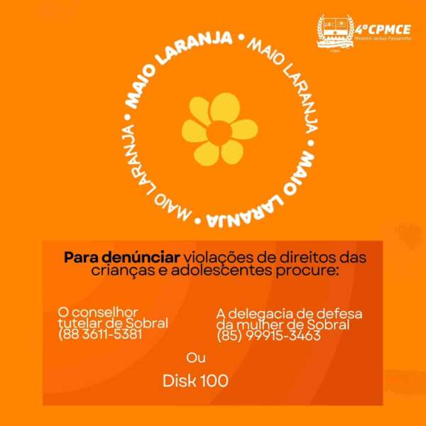 O Dia 18 de maio é o dia nacional de combate ao abuso e à exploração sexual infantil no Brasil. O mês como um todo já é convencionado como o maio laranja por ser dedicado a essa temática. Envolvidos e preocupado com esse tema, o 4⁰CPM recebeu durante a semana passada a visita e uma palestra de uma equipe de policiais civis da delegacia de defesa da mulher de Sobral, a quem agradecemos na pessoa da Dra. Delegada Rita Helena
