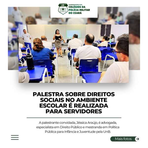 Aos servidores da Coordenadoria dos Colégios da Polícia Militar e aos agentes do 1º CPM, foi oferecida uma palestra sobre “Direitos Sociais no Ambiente Escolar” no último dia 06 de novembro. A palestrante convidada, Jéssica Araújo, é advogada, especialista em Direito Público, e mestranda em Política Pública para Infância e Juventude pela UnB, além de professora universitária. Com uma ampla experiência como consultora e pesquisadora em Direitos Humanos e facilitadora em práticas restaurativas, ela trouxe conhecimentos e reflexões relevantes sobre a temática. O evento ocorreu às 15h, no 1º CPMGEF, como parte da Formação Continuada em Direitos Sociais.